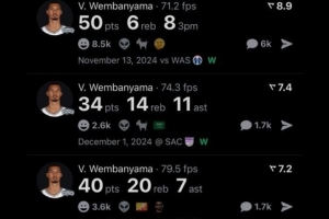 美媒晒出了文班生涯离谱的单场数据,并写道:他才21岁!