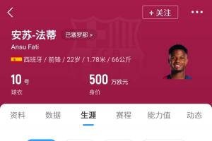 22岁的法蒂上赛季仅代表巴萨出战11场比赛,共计298分钟,0球0助,球员巅峰身价8000万欧,如今只剩500万欧。