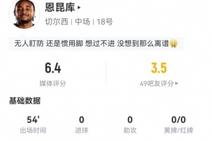 获评6.4分当前全队最低