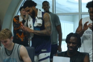 三球、格威、迈尔斯-布里奇斯、布兰登-米勒以及刚加盟的塞克斯顿在一旁鼓掌表示欢迎。