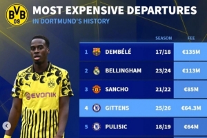 多特历史卖人榜:登贝莱、贝林均过亿,桑乔、吉滕斯、哈兰德在列