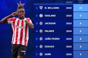 体育资讯7月6日讯 德国转会市场列出了目前球员最长合同排名,尼科-威廉姆斯10年居首,哈兰德9年次席,前10切尔西占7席。