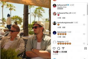 哈弗茨与厄德高一起度假,他在社交媒体上晒出两人的合照,配文:“美好时光。”