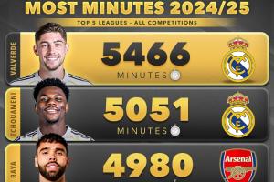 体育资讯07月06日讯 外媒score90统计了本赛季至今五大联赛球员在俱乐部的出场时间,巴尔韦德以5466分钟断层排名第一,第二则是他的队友琼阿梅尼。